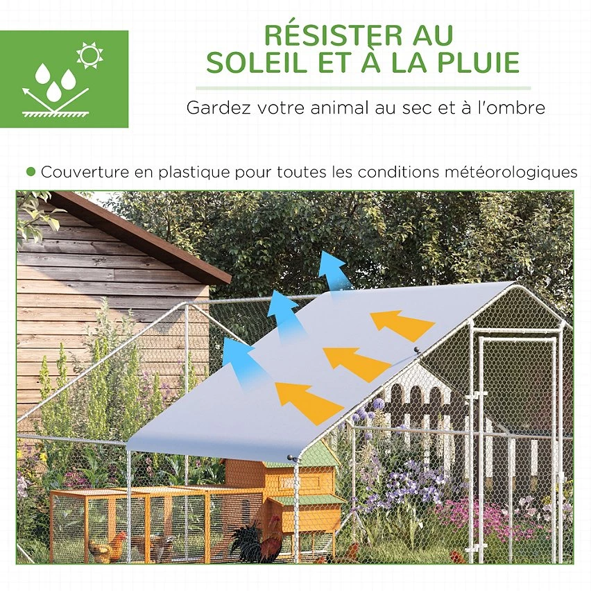 – Poulailler chenil couvert avec une bâche en PE haute densité 210D (bâche imperméable & anti-UV fournie avec cordons de maintien à la structure)
