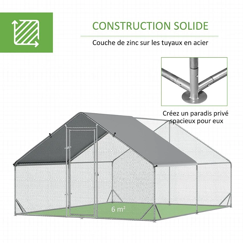– Enclos, habitat extérieur idéal pour un élevage de nombreuses poules. Ses grandes dimensions offriront à vos animaux une liberté de mouvement et un espace optimal pour leur plus grand confort