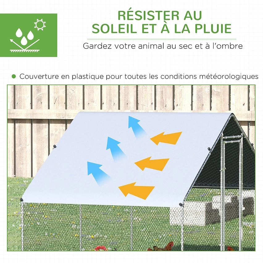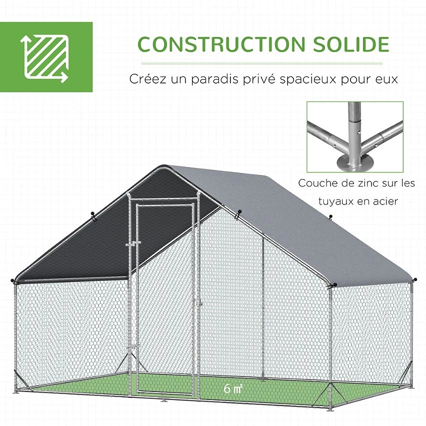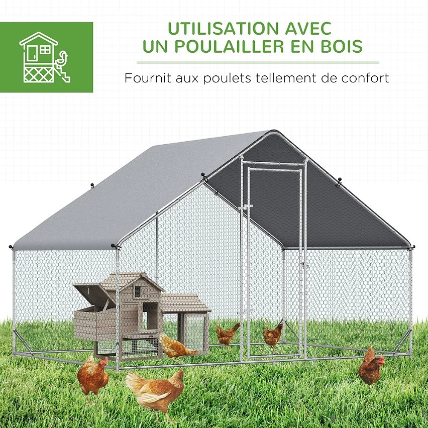 – Enclos, habitat extérieur idéal pour un élevage de 4 à 6 poules. Ses grandes dimensions offriront à vos animaux une liberté de mouvement et un espace optimal pour leur plus grand confort
