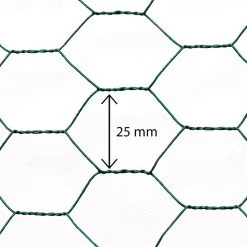 Ne cherchez plus, nous avons trouvé la solution idéale pour augmenter le terrain de vos animaux et protéger vos cultures des prédateurs ! Le grillage en acier galvanisé de 1x25M vous permet de créer l’espace que vous souhaitez grâce à ses larges dimensions et à sa maniabilité. Avec ses 25M de longueur, le grillage triple torsion en revêtement PVC vert est idéal pour l’extérieur. Vous pouvez sécuriser de grands espaces, afin de protéger vos animaux comme vos cultures.Parfaitement adapté aux animaux, ce grillage souple et ses mailles de 25mm sont parfaites pour accueillir vos animaux. Conseil : pour une protection optimale de vos animaux, pensez à les rentrer chaque soir dans leur poulailler ou abri. Robuste et facile à installer, vous pouvez découper et ajuster à votre guise ce grillage hexagonal, selon vos envies et vos besoins. Fabriqué en acier galvanisé, sa surface est recouverte d’un revêtement en PVC de coloris vert. Multifonction, ce grillage de 25M peut vous servir dans de nombreuses occasions : pour protéger vos cultures des animaux, pour clôturer votre potager, pour créer une clôture extérieure ou encore comme support pour des plantes grimpantes ! Alors n’hésitez plus et optez pour ce grillage 1x25M vert qui sera parfait pour délimiter un espace de jeux pour vos animaux ou pour vos cultures ! Dimensions de la clôture souple de jardin acier galvanisé revêtement PVC- Dimensions totales hors tout : Longueur 25 M x Hauteur 1 M- Maille de 25 mm triple torsion hexagonale- Epaisseur : 0,7 mm- Matière : acier galvanisé + revêtement PVC vertDécouvrez nos autres coloris et tailles de maille disponibles sur ce grillage : – Grillage pour poules vert 1x25M maille 13mm triple torsion clôture souple jardin animaux- Grillage pour poules 1x25M maille 13mm triple torsion clôture souple jardin animaux- Grillage pour poules 1x25M maille 25mm triple torsion clôture souple jardin animaux