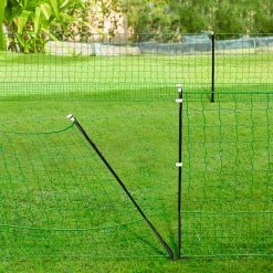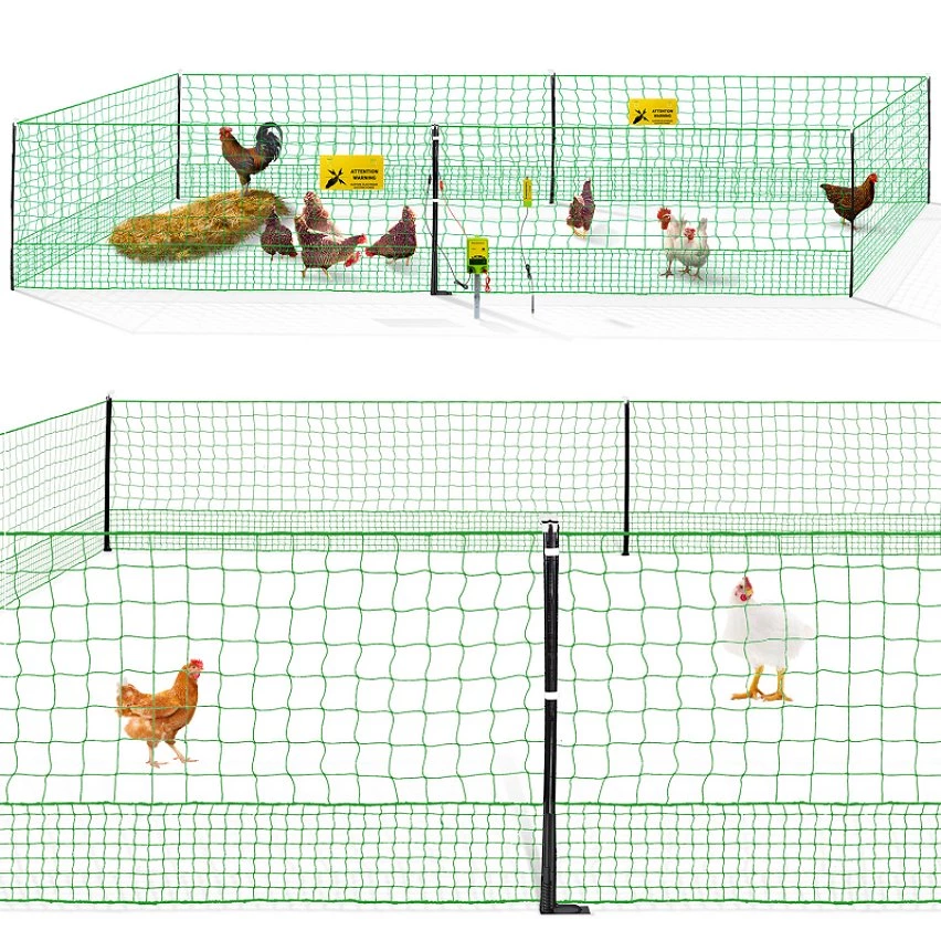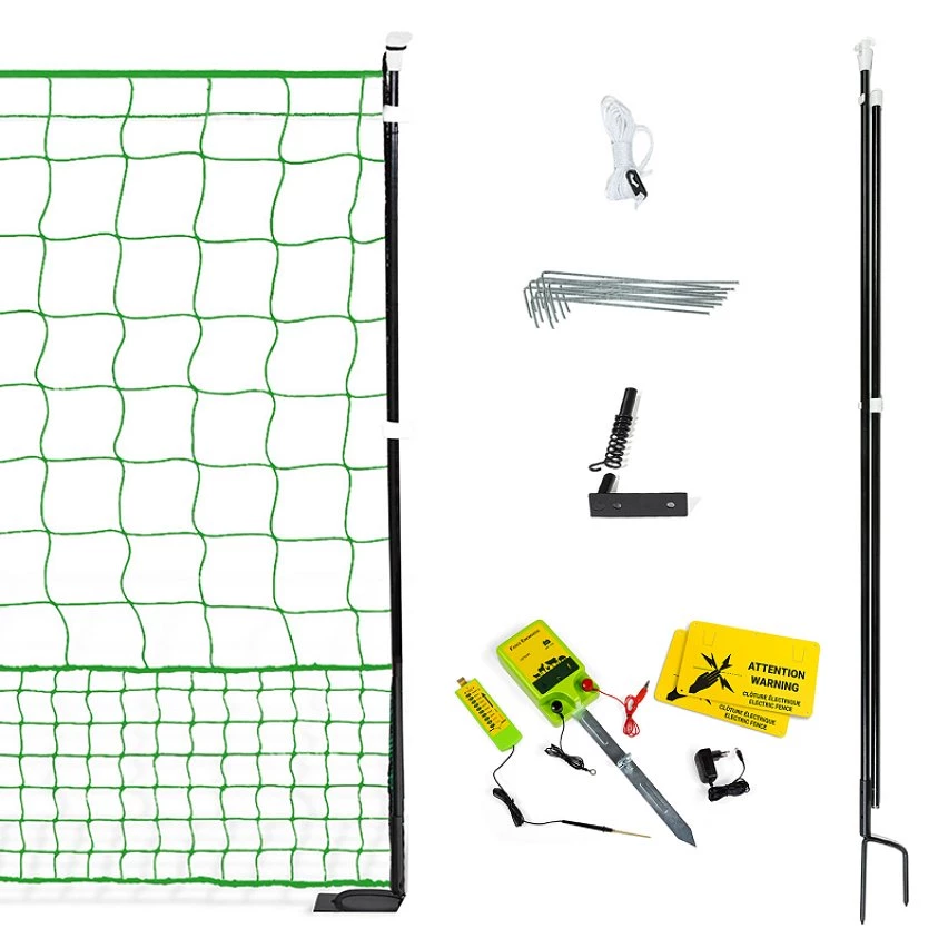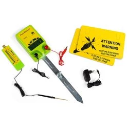 Élever ses poules en plein air c’est désormais possible ! Grâce au filet à poules électrifiable de 12 M de long et son kit de mise sous tension, vous pourrez garder vos poules dans un coin de votre jardin sans vous soucier de leur sécurité. Facile à installer, créez l’espace clos de votre choix avec vos 12 M de clôture. Avec le kit complet vous disposez de tout ce dont vous avez besoin pour protéger vos volailles : un filet de 12 M, un électrificateur à relier à une prise secteur mais aussi un testeur d’énergie. Le filet de votre kit est conçu pour éviter que vos animaux ne s’échappent mais aussi qu’aucun prédateur ne puisse venir dans le parc. Les mailles basses de 4.5 CM sont idéales pour éviter les évasions de votre basse-cour et les mailles hautes de 10 CM protègent vos animaux des fouines et des renards. Le kit est composé de matériaux robustes comme ses tiges double pointe en fibres de verre qui vous permettront de disposer d’un parc résistant aux intempéries. Le filet 12 M est muni de 4 lignes de fil en acier inoxydable vous permettant de mettre votre parc sous tension. Grâce à la porte ultra pratique, vous pourrez accéder très facilement à l’intérieur du parc sans que vos poules ne s’échappent. Créez l’espace extérieur idéal pour l’épanouissement de vos volailles sans craintes pour leur sécurité. Servez-vous de votre kit comme d’un parc, d’une extension d’un enclos ou comme barrière. Grâce à l’électrificateur et son piquet de terre, vous pouvez facilement mettre votre filet sous tension. Pour choisir le voltage idéal, utilisez le testeur, ce dernier vous indiquera la tension électrique de votre parc. N’hésitez-plus et offrez à vos animaux un espace extérieur sécurisé ! Pour une sécurité optimale, pensez à rentrer vos animaux dans leur poulailler ou enclos chaque soir. Attention : produit électrique à installer par un adulte, tenir les enfants hors de portée lors de son utilisation. Suivre les instructions de la notice pour le montage du produit. Dimensions du kit complet électrifiable filet à poules 12 M – Dimensions hors tout : Longueur 12 M x Hauteur 1,12 M- Hauteur d’un piquet : 110 CM- 4 fils en acier inoxydable pour mise sous tension- Filet en plastique vert- Casquette et fil blancs- Electrificateur : Energie de charge 1J – Energie de décharge 0.75J – Tension maxi 3700V – Tensions maxi à vide 11 000 V – Consommation électrique 2W – Indice de protection IPX6Chaque kit complet de 12 M est composé de : – 1 filet- 5 tiges (double pointes) de fibres de verre avec 12 vis pour tige de fibres de verre- 6 casquettes- 4 fils en acier inoxydable pour mise sous tension- 1 poteau de porte avec 1 plaque de porte et 1 pièce de connexion de porte- 16 chevilles- 1 électrificateur prise secteur + 1 piquet de terre- 1 testeur- 1 chargeur – 2 panneaux “danger”- 1 câble électrique