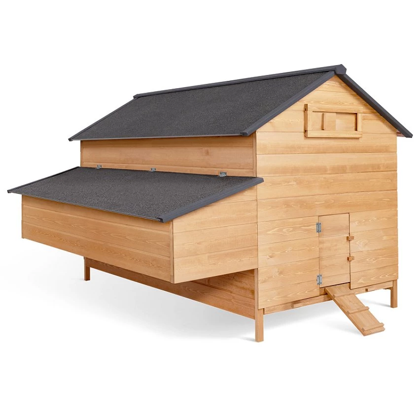 Offrez un confort de ponte à vos poules et un grand espace avec le poulailler chalet en bois qui peut accueillir jusqu’à 18 poules ! Fabriqué avec des matériaux de qualité, il dispose de tous les éléments nécessaires au bien-être de vos poules. Pratique et ultra-équipé, le poulailler en bois est composé de nombreuses ouvertures qui permettent à vos poules d’aller et venir selon leurs envies. La porte d’entrée est accessible grâce à une rampe et peut être fermée la nuit à l’aide de loquets en bois, protégeant ainsi vos poules de tous prédateurs nocturnes. La partie de droite dispose également d’un accès facile grâce à une ouverture de 123,5 CM par 32,5 CM qui se ferme avec des loquets. Ne vous préoccupez plus pour leur sécurité, elles seront à l’abri ! Aussi pensé pour vous, le poulailler propose ergonomie et praticité grâce à son toit bitumé waterproof et son double tiroir à déjections : vous pourrez accéder facilement à l’intérieur et nettoyer rapidement en toute simplicité. Conçu dans un souci de bien-être pour vos poules, le poulailler propose un très large pondoir séparé en quatre compartiments par des cloisons. Afin de favoriser au mieux la ponte, une trappe à l’avant avec cache est présente et permet de garder l’obscurité dans le poulailler. Voyez encore plus grand pour vos poules, offrez leur un maxi espace et du confort ! Dimensions du poulailler 15 à 18 poules- Dimensions totales hors tout : Longueur 150 CM x largeur 146 CM x Hauteur 118 CM- Dimensions de la porte d’entrée : Longueur 20 x Hauteur 30 CM- Dimensions totales du pondoir : Longueur 143,5 x largeur 40 x Hauteur 32 à 38 CM- Dimensions de la trappe à droite : Longueur 123,5 x largeur 32,5 CMCe modèle de poulailler existe aussi en autre taille :- Poulailler chalet 6 à 10 poules avec pondoir en boisDécouvrez également tous nos modèles de poulaillers disponibles sur notre boutique en ligne !– Produit non livrable en Corse —