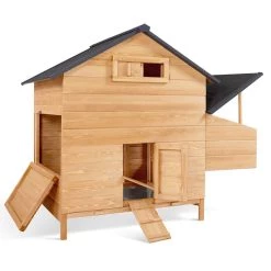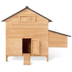 Offrez un confort de ponte Ă vos poules et un grand espace avec le poulailler chalet en bois qui peut accueillir jusqu’Ă 10 poules ! FabriquĂ© avec des matĂ©riaux de qualitĂ©, il dispose de tous les Ă©lĂ©ments nĂ©cessaires au bien-ĂȘtre de vos poules. Pratique et ultra-Ă©quipĂ©, le poulailler en bois est composĂ© de nombreuses ouvertures qui permettent Ă vos poules d’aller et venir selon leurs envies. La porte d’entrĂ©e est accessible grĂące Ă une rampe et peut ĂȘtre fermĂ©e la nuit Ă l’aide de loquets en bois, protĂ©geant ainsi vos poules de tous prĂ©dateurs nocturnes. La partie de droite dispose Ă©galement d’un accĂšs facile grĂące Ă une ouverture de 64 par 32.5 cm qui se ferme avec des loquets. Ne vous prĂ©occupez plus pour leur sĂ©curitĂ©, elles seront Ă l’abri ! Aussi pensĂ© pour vous, le poulailler propose ergonomie et praticitĂ© grĂące Ă son toit bitumĂ© waterproof amovible et son double tiroir Ă dĂ©jections : vous pourrez accĂ©der facilement Ă l’intĂ©rieur et nettoyer rapidement en toute simplicitĂ©. Conçu dans un souci de bien-ĂȘtre pour vos poules, le poulailler propose un large pondoir sĂ©parĂ© en deux compartiments par une cloison. Afin de favoriser au mieux la ponte, une trappe avec cache est prĂ©sente et permet de garder l’obscuritĂ© dans le poulailler. Voyez grand pour vos poules, offrez leur espace et confort ! Dimensions du poulailler chalet 6 Ă 10 poules- Dimensions totales hors tout : Longueur 146 CM x largeur 86 CM x Hauteur 118 CM- Dimensions de la porte d’entrĂ©e : Longueur 20 x Hauteur 30 CM- Dimensions de la trappe (droite) : Longueur 64 x Hauteur 32.5 CM- Dimensions globales du pondoir : Longueur 83.5 x largeur 40 x Hauteur 32/38 CMCe modĂšle de poulailler existe aussi en autre taille :- Poulailler chalet 15 Ă 18 poules avec pondoir en boisDĂ©couvrez Ă©galement tous nos modĂšles de poulaillers disponibles sur notre boutique en ligne !