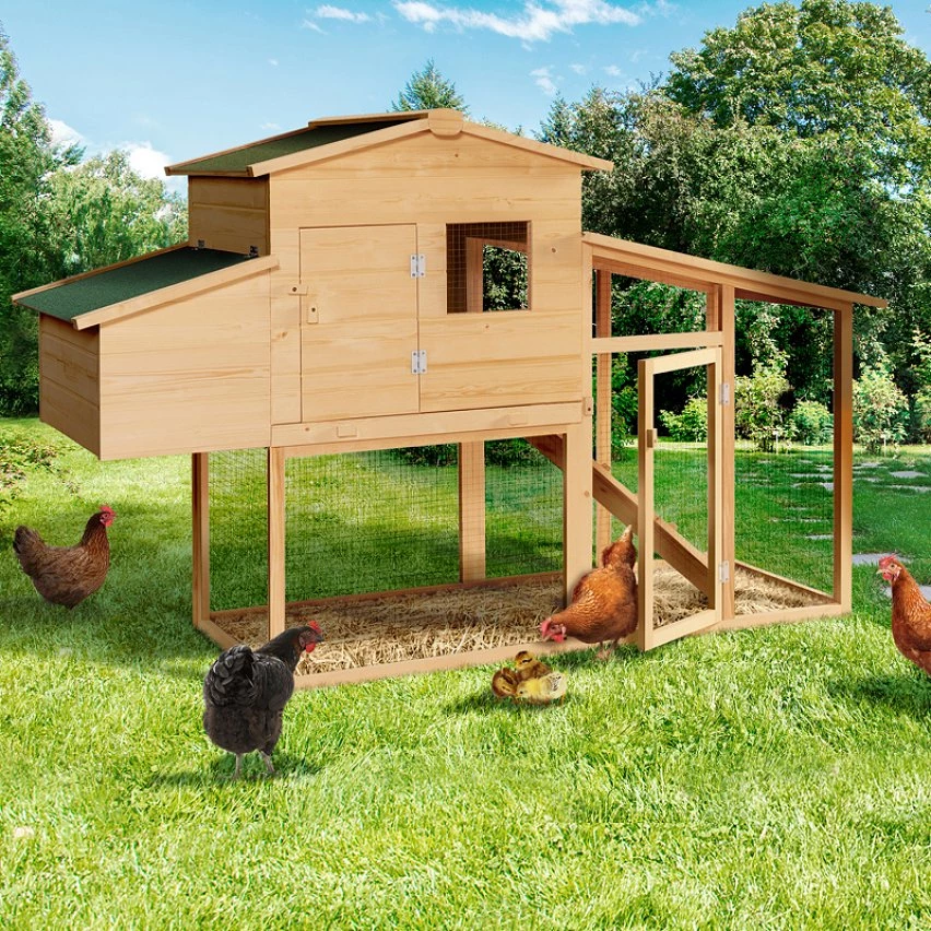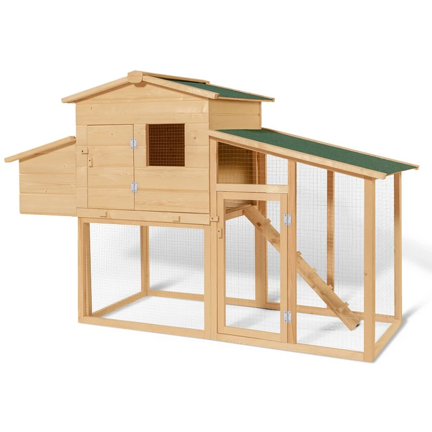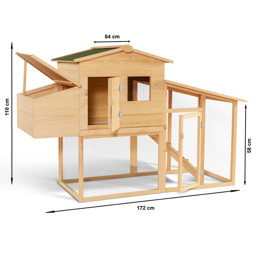 Pensé par des éleveurs pro, voici l’abri surélevé avec pondoir tout confort idéal pour vos poules ou vos volailles afin de les protéger la nuit des prédateurs ou encore des intempéries.Ce refuge pour petits animaux (lapins/rongeurs/poules/canards) a été fabriqué pour garantir leur plus grand confort:- 1 étage bien isolé avec compartiment pondoir pour favoriser la pondaison et le repos- 1 toit bitumé waterproof pour les isoler de l’humidité et de la pluie- 1 large rampe pour accéder à l’étage facilement- 1 grande porte située sur la partie inférieure pour que les animaux puissent entrer ou sortir à leur guiseEsthétique et fonctionnel, ce poulailler allie aussi confort et praticité pour vous !Ramassez tous les jours de bons œufs frais grâce au compartiment pondoir avec toit amovible !De plus ce clapier est muni d’un tiroir de déjection amovible pour faciliter son entretien et garder ainsi un espace propre.Cet abri convient pour 2 à 3 poules. Dimensions du poulailler COMFORT en bois- Dimensions totales hors tout : Longueur 172 CM x largeur 64 CM x Hauteur 110 CM- Structure en bois de sapin traité, avec un grillage métallique- Dimensions du pondoir : 48 x 35 x 35 CM- Dimensions de la porte grillagée : 56,5 x 30 CM- Dimensions de la porte : 23 x 37 CM- Dimensions de la fenêtre : 18 x 18 CM- Dimensions du tiroir : 50 x 58 CMCe modèle de poulailler existe aussi en différentes versions :- Poulailler VIP avec clapier double XXL en bois- Poulailler PREMIUM avec clapier en boisDécouvrez également tous nos modèles de poulaillers disponibles sur notre boutique en ligne !