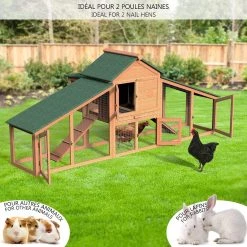 Le poulailler sur pilotis en bois brut de qualitĂ© supĂ©rieure vous permet de protĂ©ger vos poules de tous les prĂ©dateurs. Vous pouvez dĂ©sormais avoir de bons Ćufs frais Ă portĂ©e de main tous les jours grĂące Ă cet abri chaleureux surĂ©levĂ© oĂč vos poules se sentiront en parfaite sĂ©curitĂ© ! Cet habitat en bois dispose d’un toit en goudron gris et de 4 pieds qui rehaussent la maisonnette, de quoi Ă©viter tout risque d’humiditĂ© liĂ© au sol ! Ălevez vos poules Ă l’abri du danger en les rentrant tous les soirs et en fermant les portes Ă l’aide du systĂšme Ă loquet ! ComposĂ© d’une Ă©chelle et d’une porte latĂ©rale donnant dans l’entrĂ©e de la maisonnette, le poulailler sur pilotis offre Ă©galement une facilitĂ© d’accĂšs au pondoir grĂące Ă son toit relevable. DotĂ© d’un double espace de ponte, vos poules pourront aller et venir selon leurs envies. L’abri est Ă©quipĂ© d’un tiroir Ă dĂ©jection en contreplaquĂ© (mĂ©lamine), ce qui facilite beaucoup son nettoyage ! C’est l’occasion pour vos poules de trouver un abri chaleureux et surĂ©levĂ© facilement accessible pour leur gabarit. Prenez soin de vos poules en les mettant Ă l’abri dans un habitat confortable et surĂ©levĂ© ! Dimensions du poulailler sur pilotis- Dimensions totales hors tout : Longueur 107 CM x largeur 63 CM x Hauteur 70,5 CM (toit compris)- CapacitĂ© d’accueil : 4 poules- Dimensions des pieds : L. 3 x l. 2 x H. 6 CM- Dimensions de la porte de devant : L. 24 x H. 33,5 CM- Dimensions de la porte latĂ©rale : L. 24 x H. 33,5 CM- Dimensions de la maisonnette : L. 70 x l. 63 x H. 64,5 CM- Dimensions du pondoir : L. 37 x l. 61,3 x H. 30,5 Ă 38 CMDĂ©couvrez Ă©galement tous nos modĂšles de poulaillers disponibles sur notre boutique en ligne !