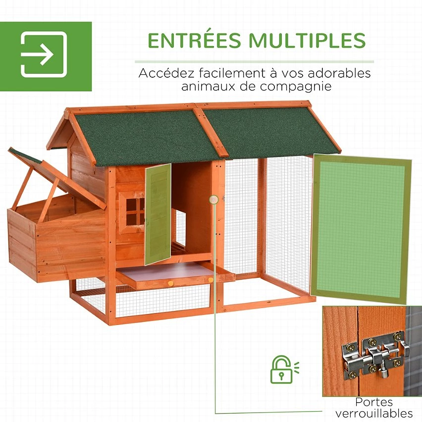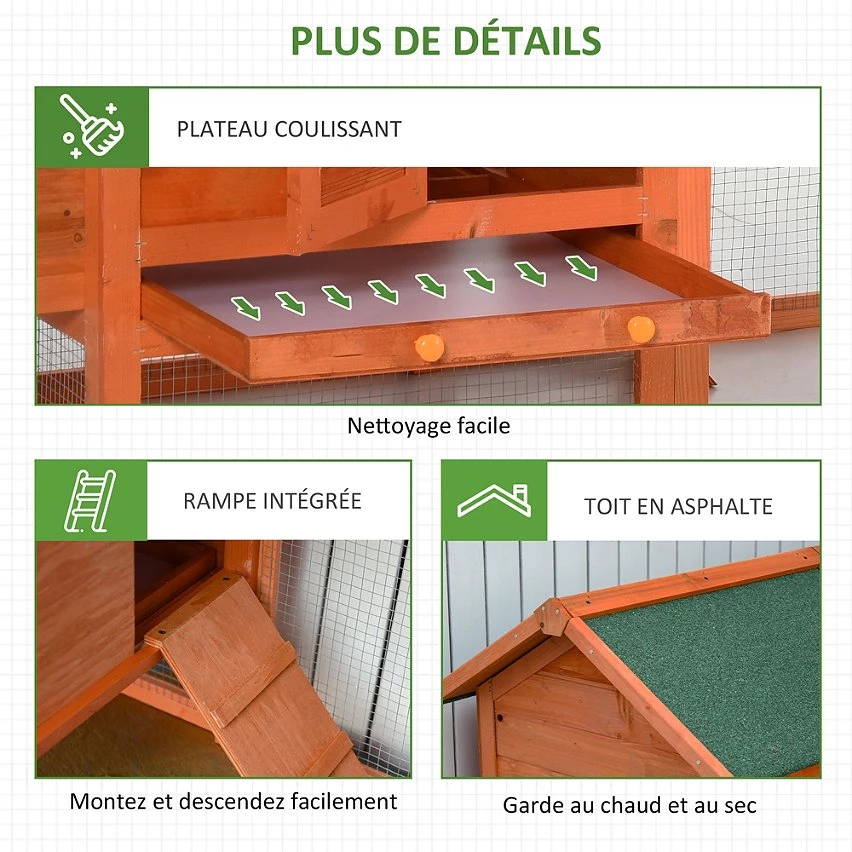 – Cage Ă poules multi-Ă©quipement : perchoir, pondoir avec toit ouvrant, rampe, aire de jeux totalement abritĂ©e, tiroir Ă dĂ©jection coulissant, etc.